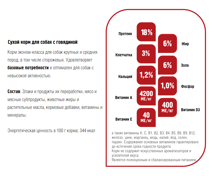 Энергетическая ценность в 100 г корма: 344 ккал.