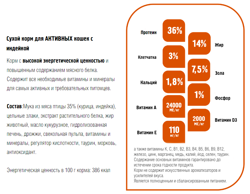 Энергетическая ценность в 100 г корма: 386 ккал.