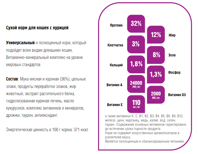 Энергетическая ценность в 100 г корма: 371 ккал.