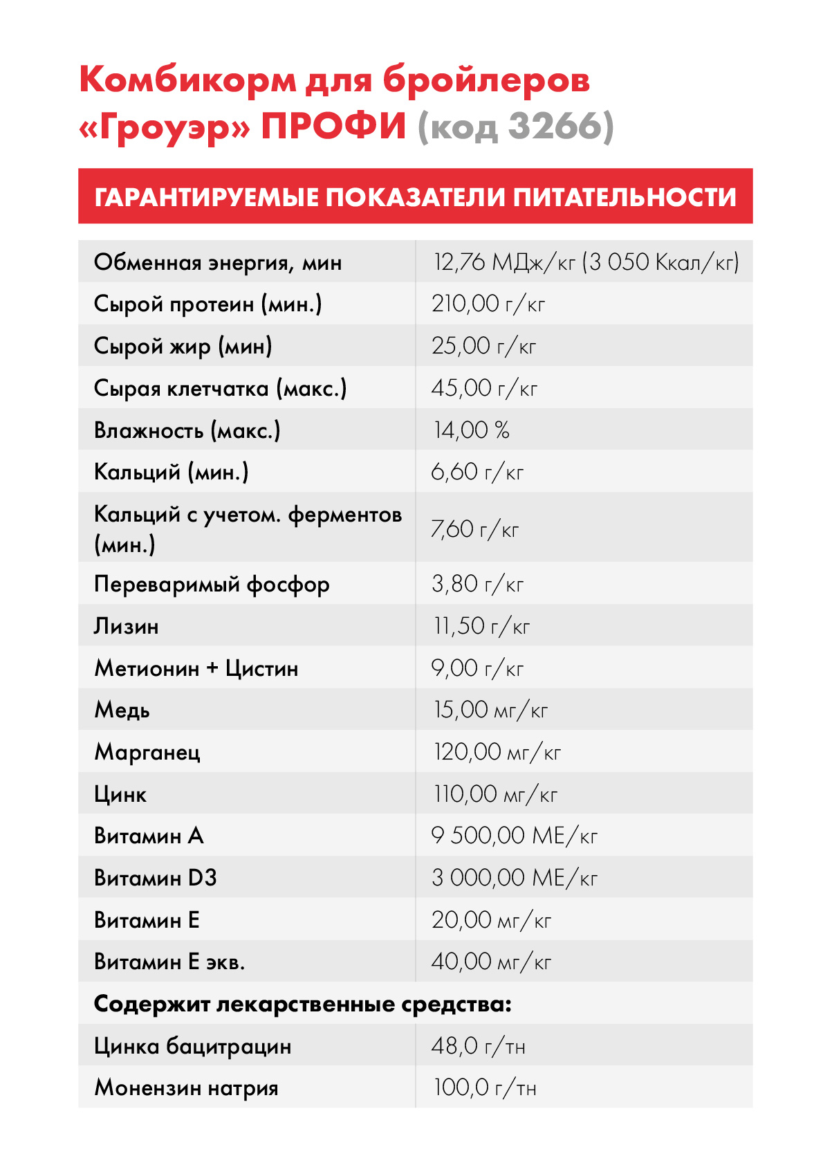 Зерновые, шроты, сырье животного происхождения, продукты переработки сои, пшеничный продукт, зернопродукты, зернобобовые, масло растительное стабилизированное, протеиновый концентрат, витаминно- минеральный премикс (в т. ч. витамин Е-аналог), аминокислоты, соль, сода, известняк, холин хлорид, макроэлементы, бетаин гидрохлорид, кокцидиостатик, кормовой антибиотик, фитогеники, закрепитель гранулы, антиоксидант, ферменты.