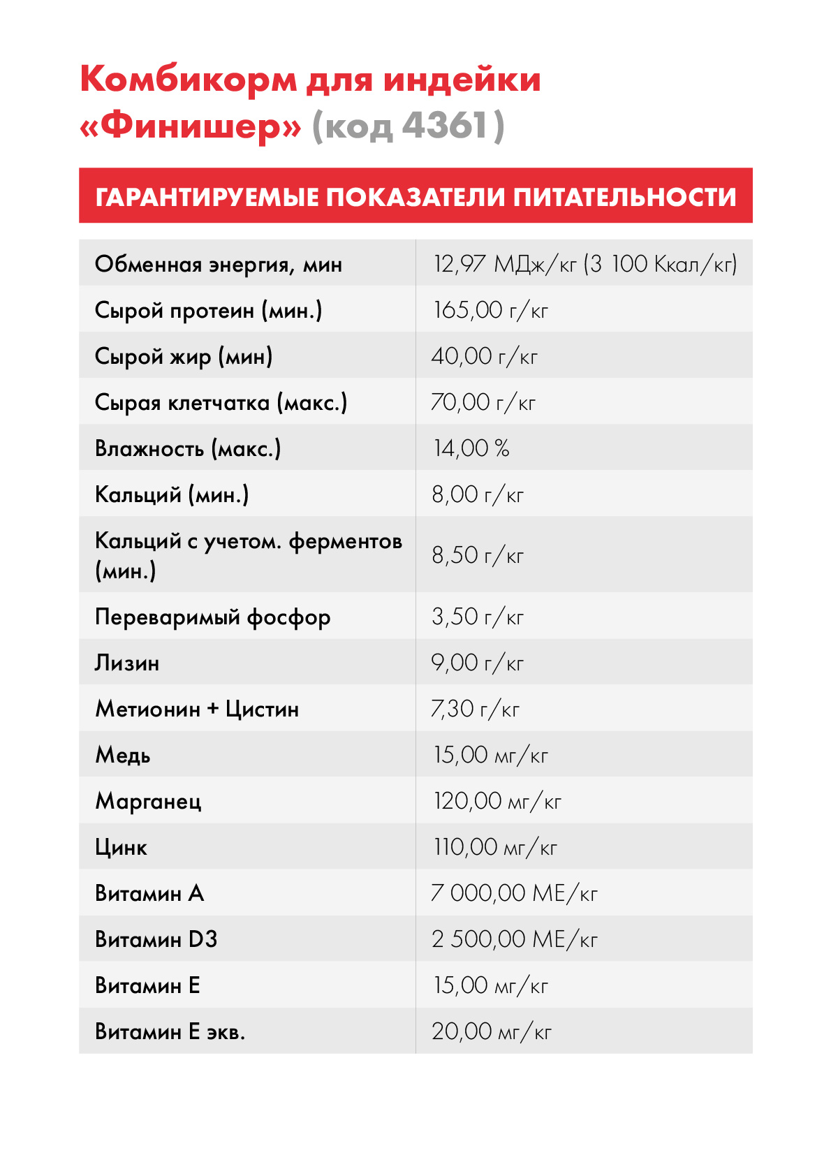 - Живая масса самок к 20 неделе*: 13 кг при коэффициенте кормоконверсии 3,3: