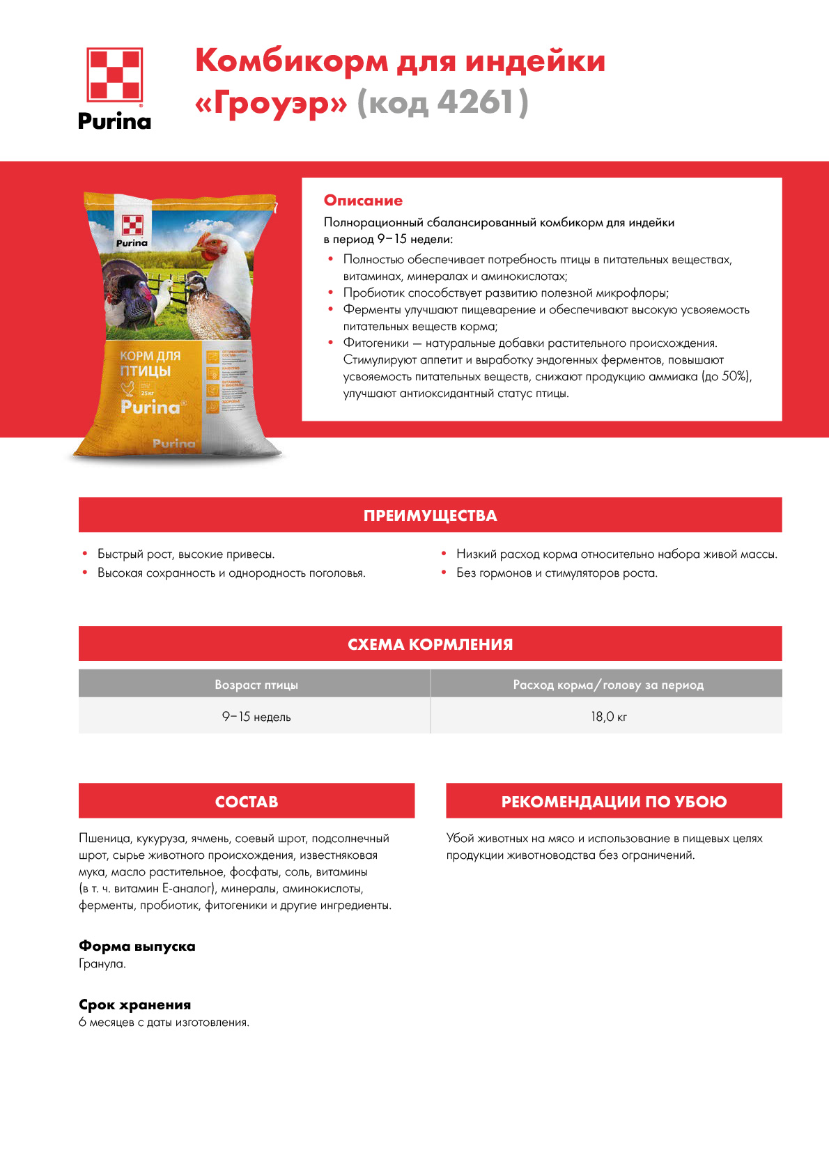 - Полностью обеспечивает потребность птицы в питательных веществах, витаминах, минералах и аминокислотах;
