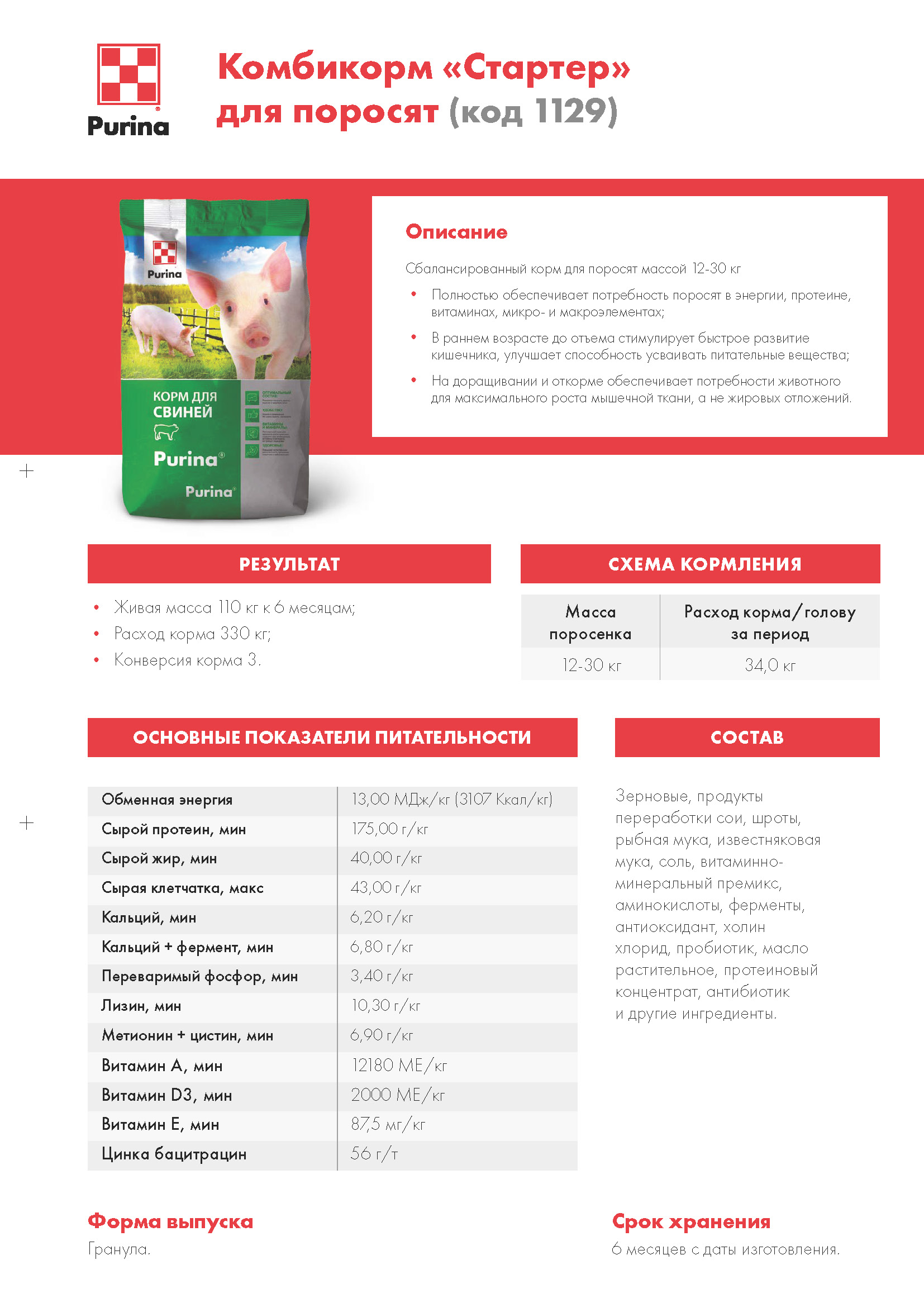 - Полностью обеспечивает потребность поросят в энергии, протеине, витаминах, микро- и макроэлементах;